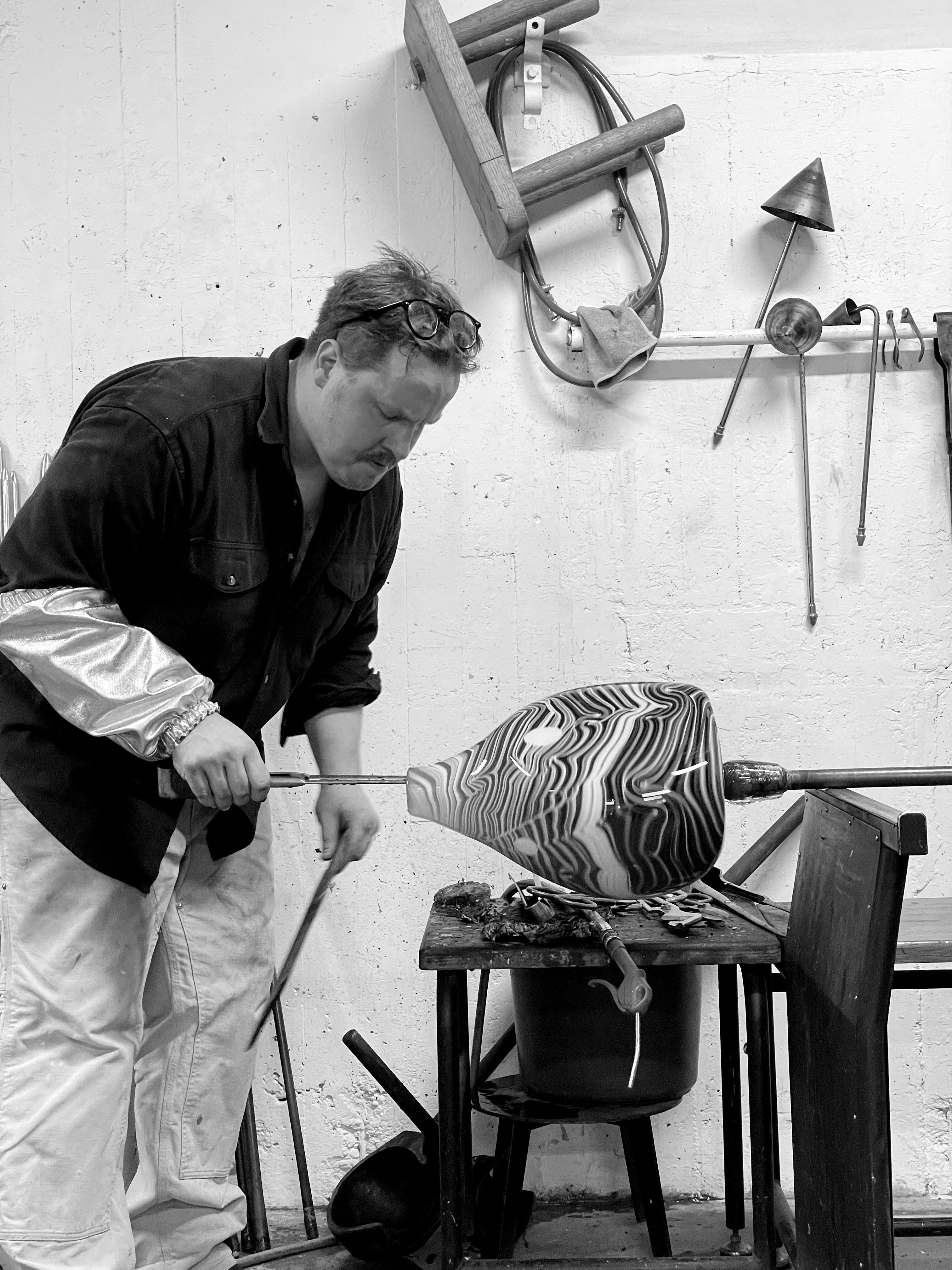 I had the desire to work in the hot shop with something that at least in theory carried something effortless and light in its appearance. A search for maximum expression with minimum means.
